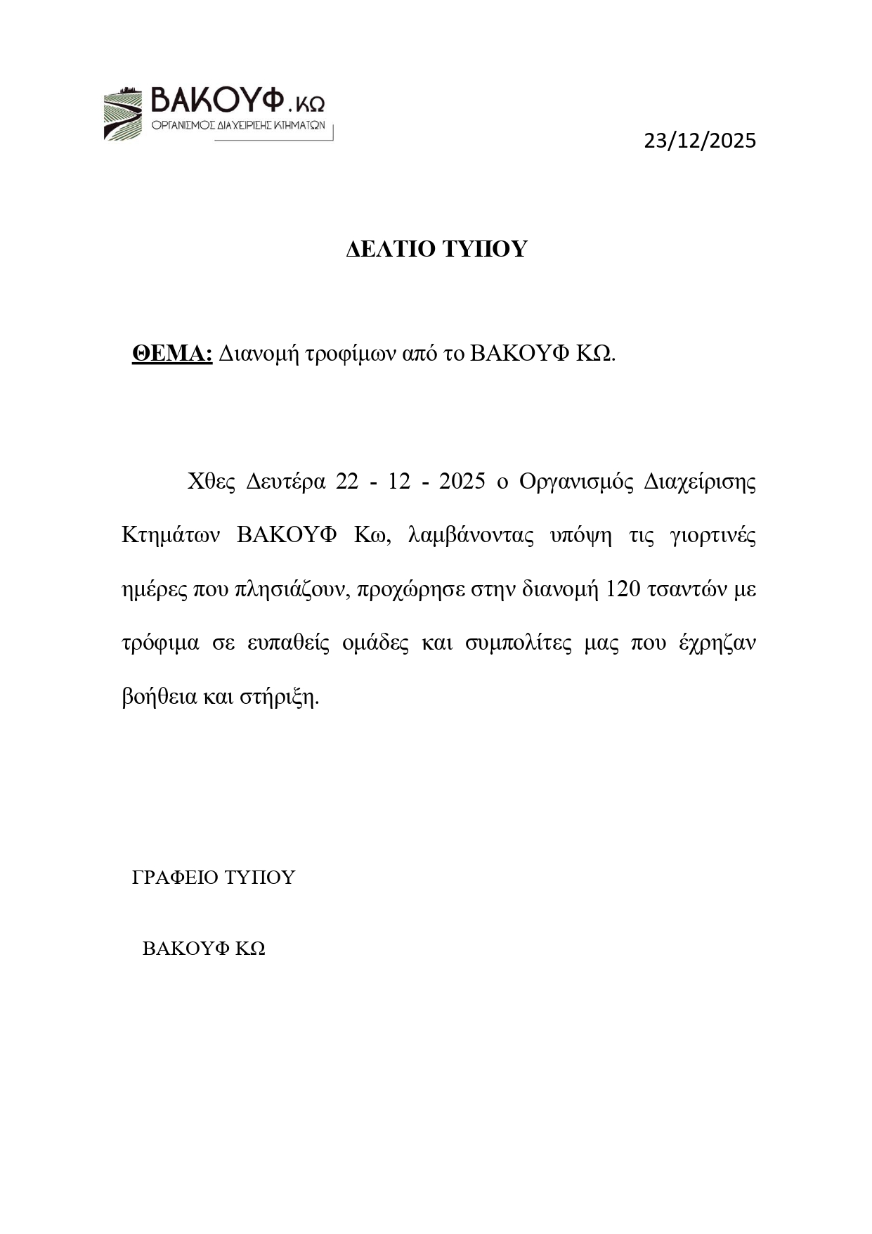 Ο Οργανισμός Διαχείρισης Κτημάτων Βακούφ Κω συνεστήθη με το Κυβ. Διάταγμα 12/2-5-1929 του Ιταλού Κυβερνήτη των νήσων του Αιγαίου, το οποίο διατηρήθηκε σε ισχύ και μετά την προσάρτηση της Δωδεκανήσου στο Ελληνικό Κράτος με την 19/29-4-1947 προκήρυξη του Στρατιωτικού Διοικητή Δωδεκανήσου…